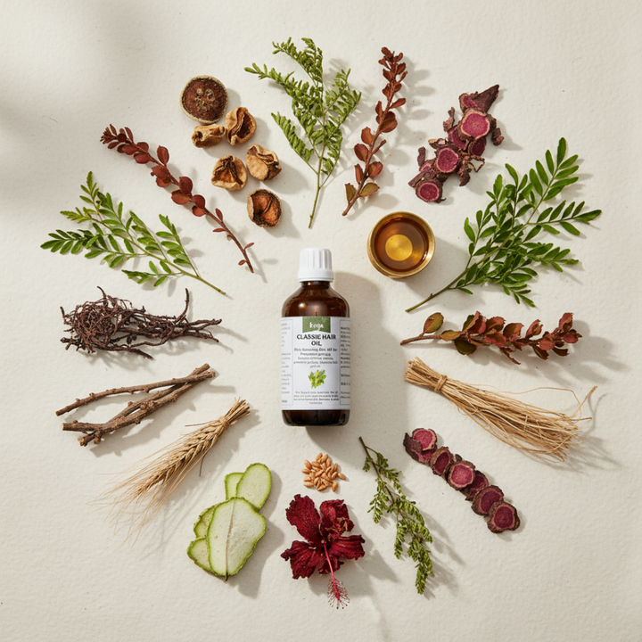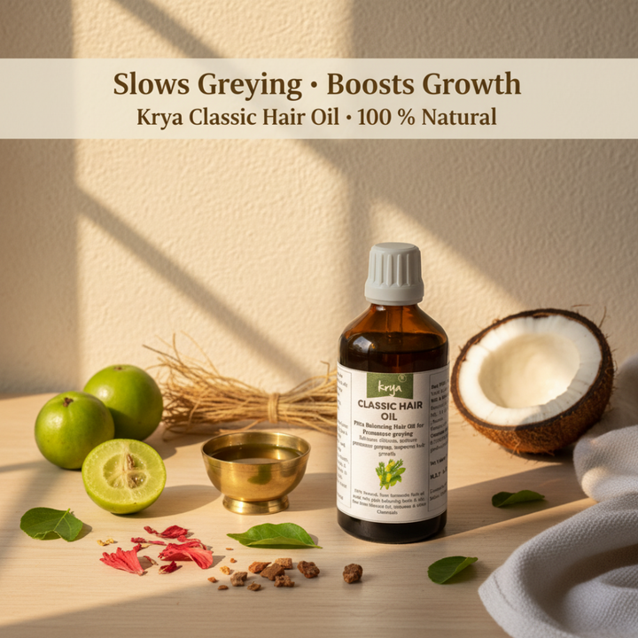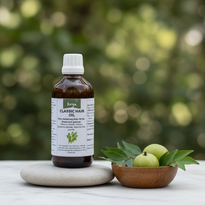 Krya Classic Hair Oil is a potent Ayurvedic formulation created to delay premature greying, rebalance excess scalp oiliness, and improve hair growth through deep, root-level nourishment.