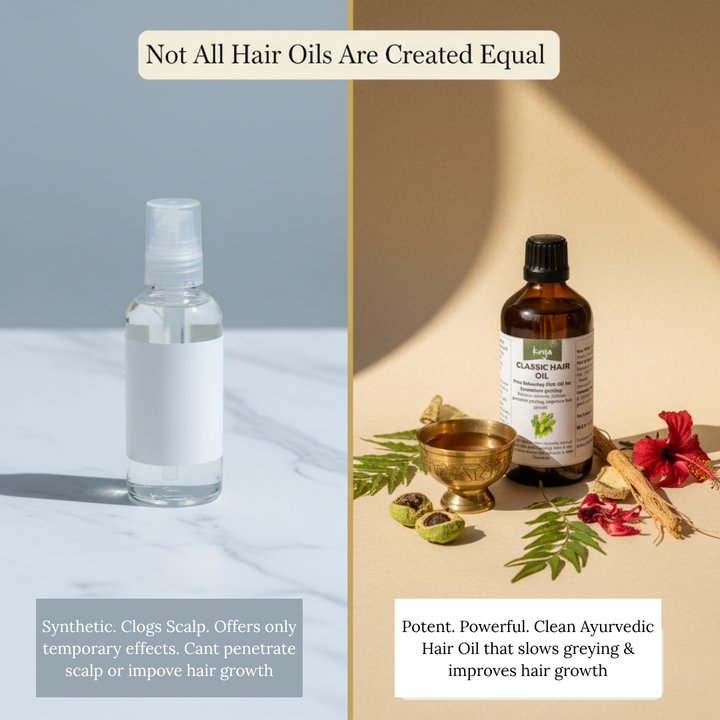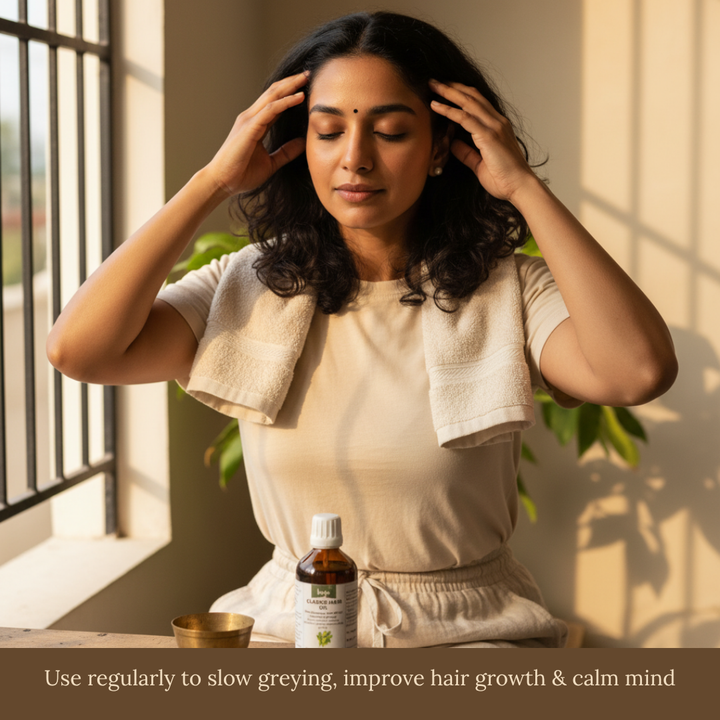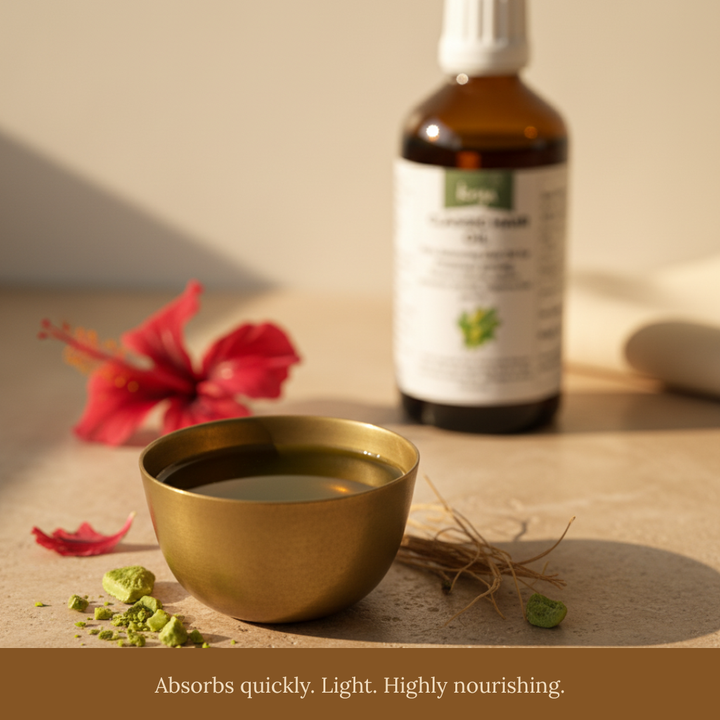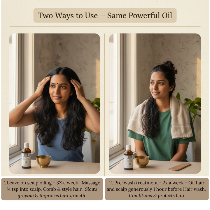 This oil is ideal for pitta-prone individuals, especially those facing greying, scalp oiliness and hair fall due to heat, stress, poor sleep, or harsh synthetic haircare. It works not just on symptoms, but on the underlying cause—cooling the scalp, regulating sebum, and restoring balance.