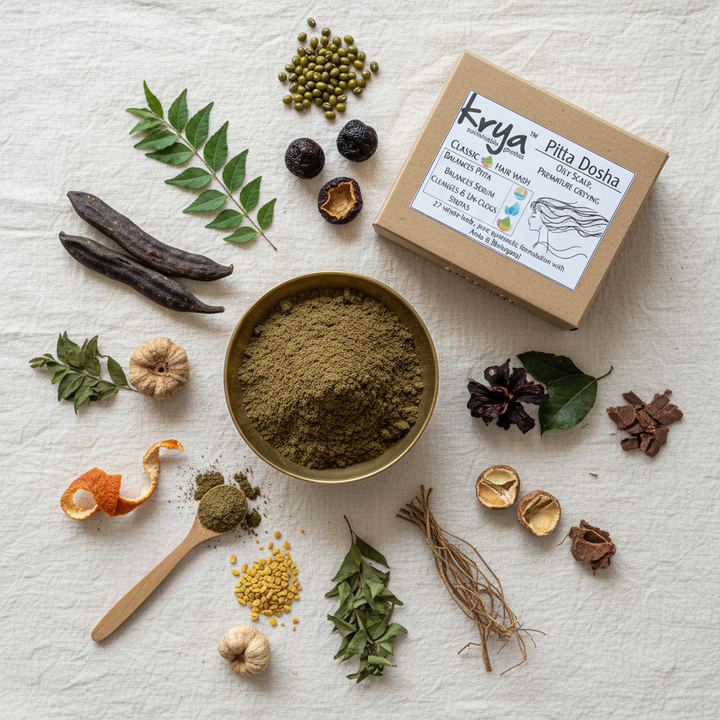 The Krya Classic Hair Wash is different — it is built entirely from whole, edible-grade Ayurvedic herbs, processed in-house to preserve potency and scent.