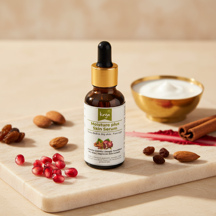 At Krya, we do not suggest using any chemical alternatives to skin care. Instead, Ayurveda offers us safe, truly healthy skin moisturisation options using skin improving Ayurvedic herbs and truly beneficial cold pressed oils. Ayurvedic texts tell us that oil formulations meant for face application have to be of a much lighter texture and quicker to absorb compared to abhyanga or hair oils. The serum needs to nourish and revitalize your skin, by absorbing deep into the skin and quenching it. Dry skin is often dull skin with uneven skin time. A good ayurvedic face serum needs to give your skin lustre and an even skin tone while working to balance imbalanced doshas, primarily vata dosha. Everyone wants healthy glowing skin. But Ayurveda tells us that great skin is a result of following a good skincare routine where your specific skin concerns have been addressed at the root cause. By addressing the root case of vata imbalance, a good ayurvedic skin serum can help you get bright skin , slow down the production of fine lines and wrinkles, repair your skin barrier and improve the texture and hydration of your skin.Krya Moisture Plus Face serum for dry skin